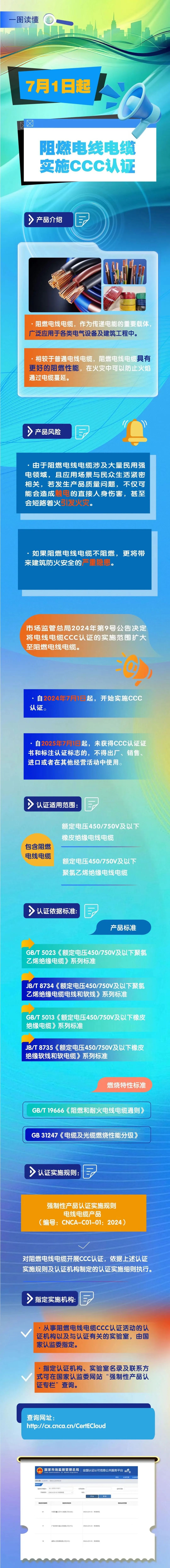 根據市場監管總局2024年第9號公告,自2024年7月1日起,對阻燃電線電纜實施強制性產品認證管理。自2025年7月1日起,未獲得CCC認證證書和標注認證標志的阻燃電線電纜,不得出廠、銷售、進口或者在其他經營活動中使用。